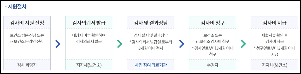 검사 신청은 주소지 관할 보건소 혹은 e보건소 공공보건포털을 통해 가능하며, 검사 신청 후 발급받은 검사의뢰서를 지참하여 사업 참여 의료기관에서 검사받으면 됩니다.