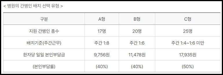 환자는 간병인 배치 유형별로 월 292,500원 ~ 537,900원을 부담하게 됩니다.