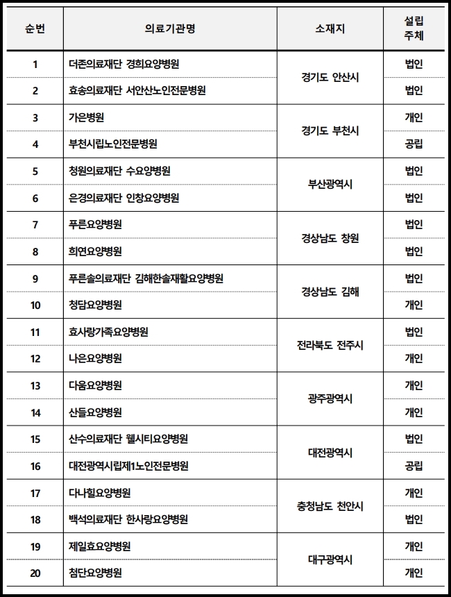 - 10개 지역 소재 20개 요양병원 선정 -