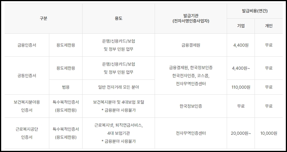 본인의 용도에 맞는 각각의 인증서를 유료 또는 무료로 발급받아 사용하시면 됩니다.