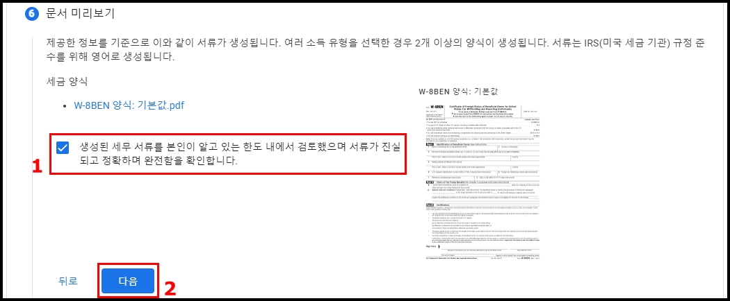 1. 생성된 세무 서류를 본인이 알고 있는 한도 내에서 검토했으며 서류가 진실되고 정확하며 완전함을 확인합니다. => 체크