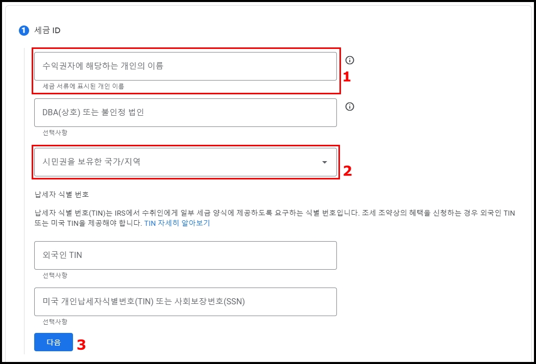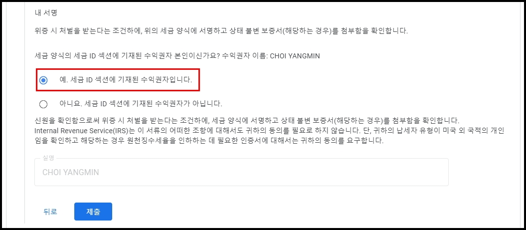 세금 양식의 세금 ID 섹션에 기재된 수익권자 본인이신가요? 수익권자 이름: => 예. 세금 ID 섹션에 기재된 수익권자입니다. => 체크