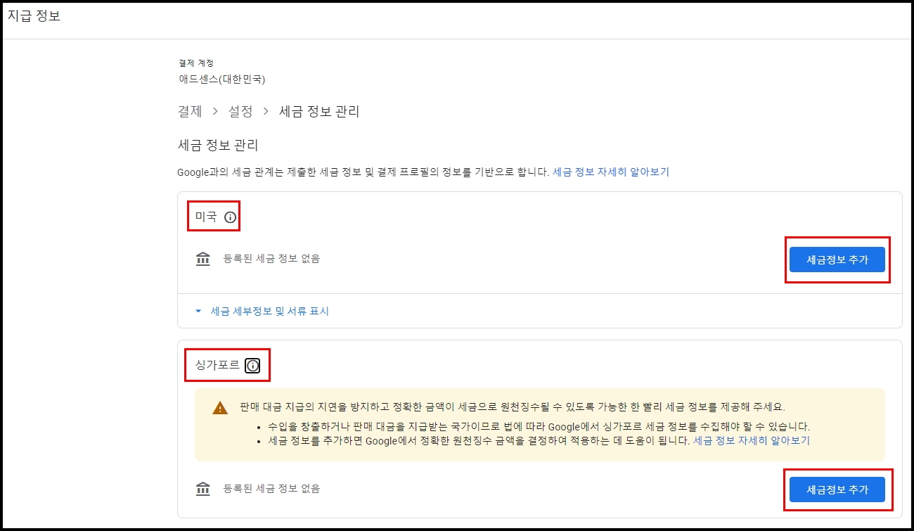 싱가로프 세금정보 추가는 미국보다는 간단하게 빨리 마무리되는 것 같습니다.