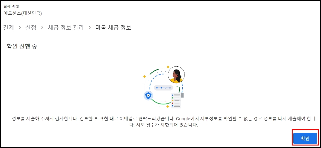 구글 애드센스 미국세금정보 제출 모든 절차가 완료되었고 입력한 정보가 정확한지 확인 검토 후 이메일 연락을 기다리면 됩니다.