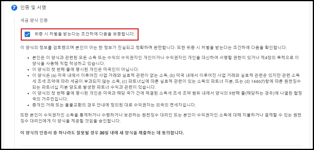 위증 시 처벌을 받는다는 조건하에, 이 세금 양식의 정보 및 진술이 변경되지 않았으며, 아래에 명시된 경우를 제외하고 정보를 입력한 연도부터 현재까지 해당 정보가 진실되고 정확하며 완전하다는 것을 확인합니다. => 체크
