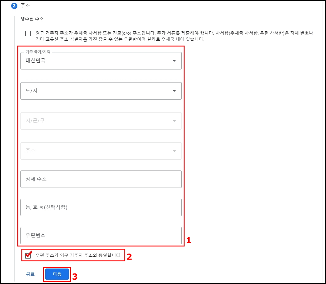 2. 우편 주소가 영구 거주지 주소와 동일합니다. 체크