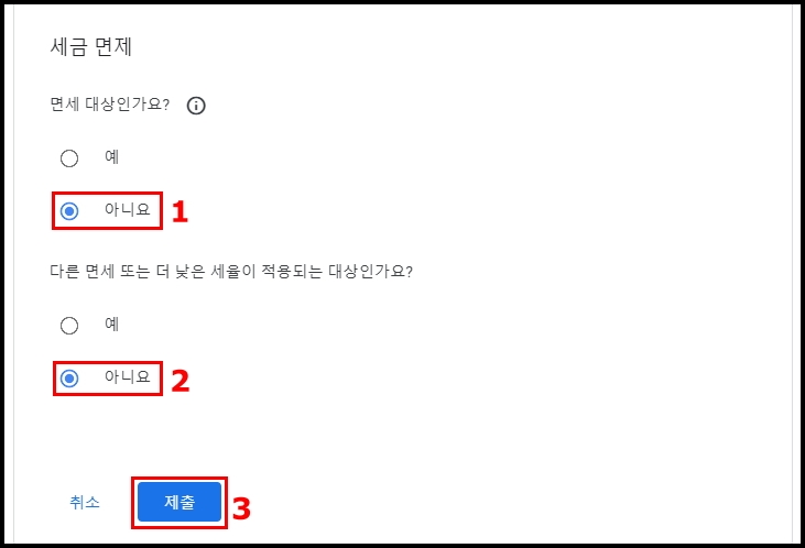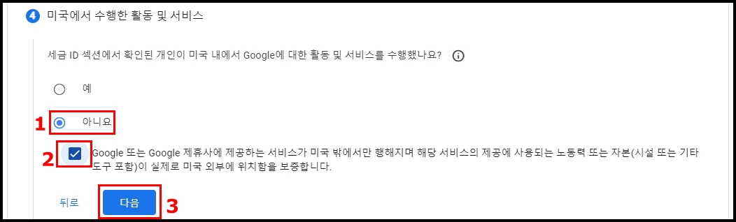 1. 세금 ID 섹션에서 확인된 개인이 미국 내에서 Google에 대한 활동 및 서비스를 수행했나요? => 아니요
