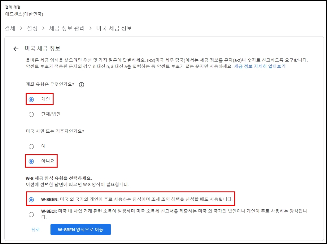 4. W-8 BEN 양식으로 이동 클릭