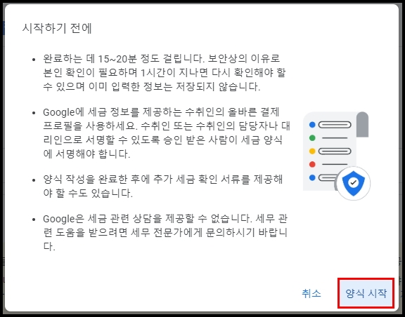 세금정보 추가를 클릭하면 시작하기 전 확인해야 할 사항에 대해서 팝업으로 알려줍니다.