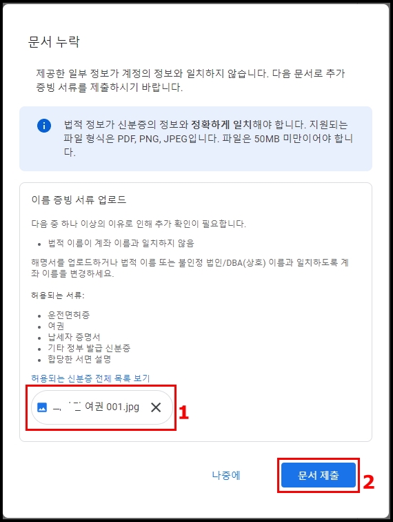 지금 당장 여권이 준비되지 않았다면 나중에 버튼을 누른 후 구글 애드센스 메인 화면 지급정보에서 누락된 서류 추가로 제출할 수 있습니다.