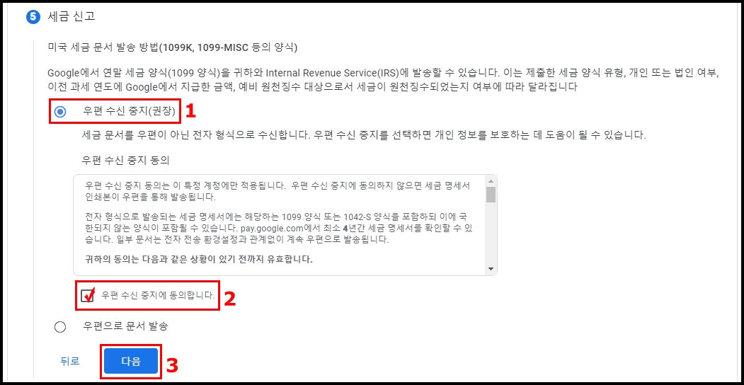 1. 우편 수신 중지(권장) : 세금 문서를 우편이 아닌 전자 형식으로 수신합니다. 우편 수신 중지를 선택하면 개인 정보를 보호하는 데 도움이 될 수 있습니다
