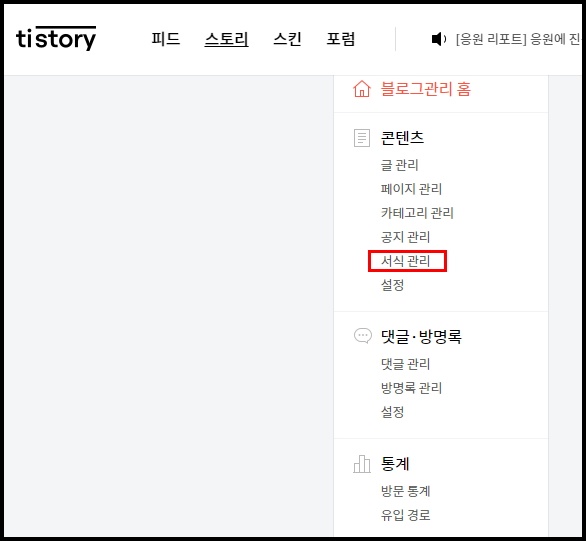 티스토리 메인 화면 좌측 메뉴바의 서식관리로 진입합니다.