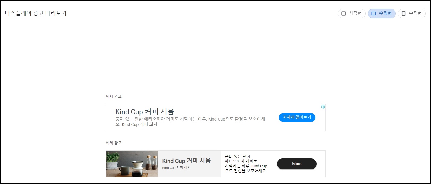 디스플레이 광고 종류는 사각형, 수평형, 수직형 세가지 형태로 만들 수 있습니다.