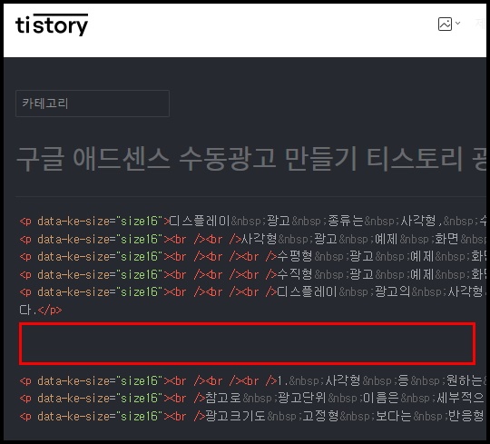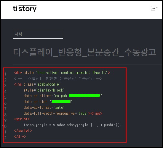 따라서 글 작성 후 발행하기 전 수동광고 코드를 꼭 넣고 발행하시기 바랍니다.