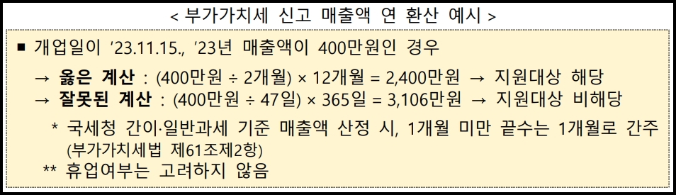 1. 대상자 선정에 활용되는 매출액은 국세청 부가가치세 신고매출액 (당해연도 연중 개업 시 연환산을 적용)이며, 개별 증빙은 불인정 단, 부가가치세 면세사업자는 사업장현황신고 상 수입금액 기준으로 판단