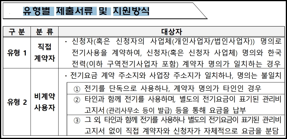 - 제출서류 : 전기를 단독으로 사용하나, 타인명의인 경우 "전기요금 고지서 사본"