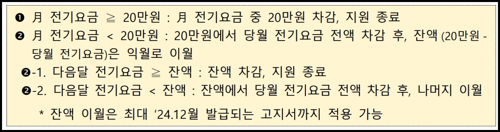 - 지급방식 : 대상자 통보 후 최초로 발행되는 ’ 24년 전기요금고지서 상 청구되는 전기요금부터 최대 20만 원 차감