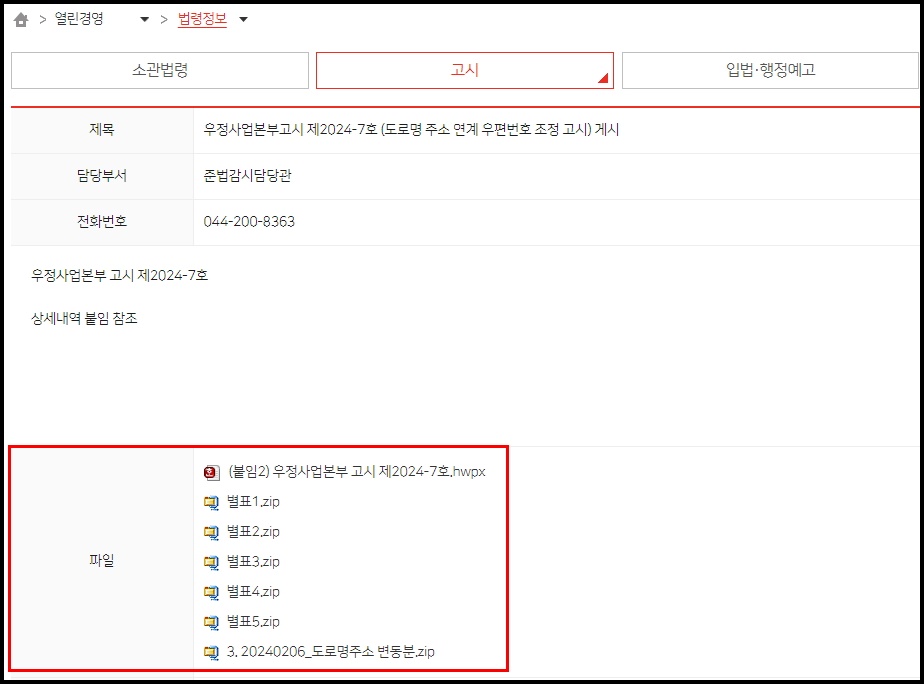 2024년 02월 06일 전국 도로명주소 연계 우편번호 조정 고시가 되었습니다.