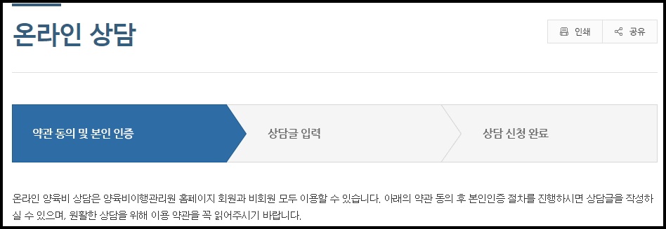 양육비 관련된 상담은 양육비이행관리원 홈페이지 회원과 비회원 모두 이용할 수 있습니다. 약관 동의 후 본인인증 절차를 진행하시면 상담글을 작성하실 수 있으며, 원활한 상담을 위해 이용 약관을 꼭 읽어주시기 바랍니다.