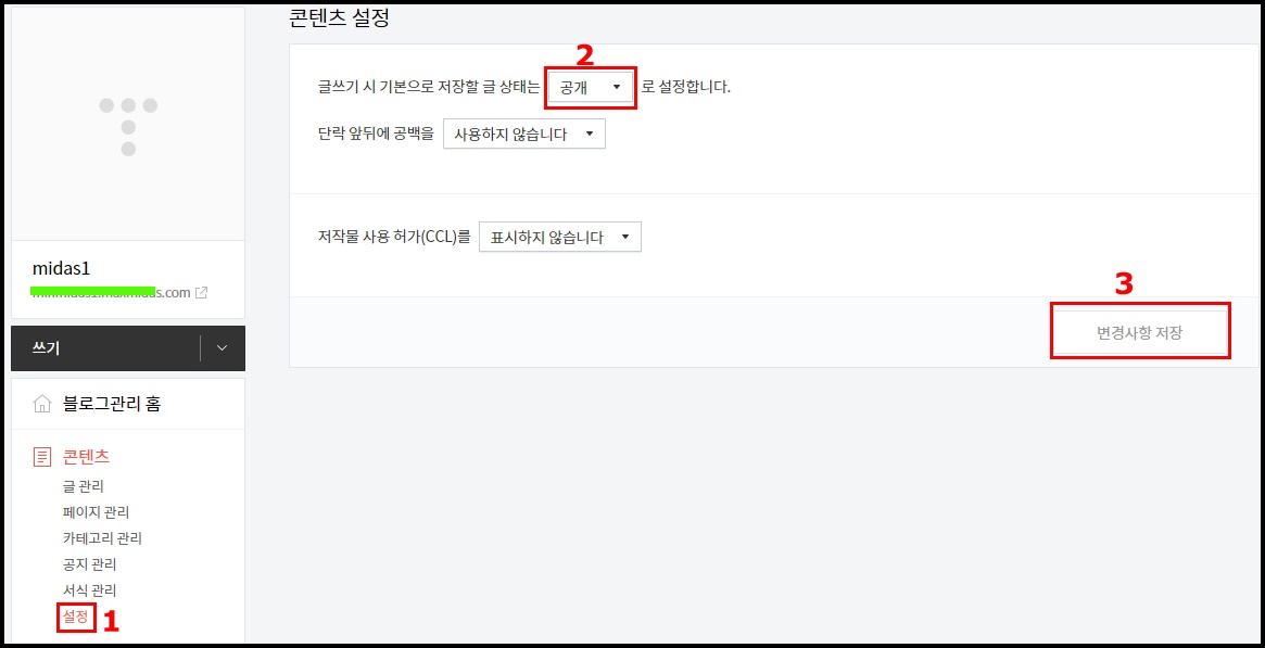 좌측 메뉴바 콘텐츠 메뉴의 하위 메뉴 중 1. "설정" => 2. 글쓰기는 "공개" => 3. 변경사항 저장
