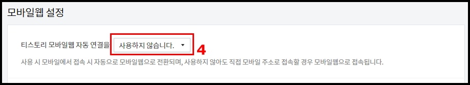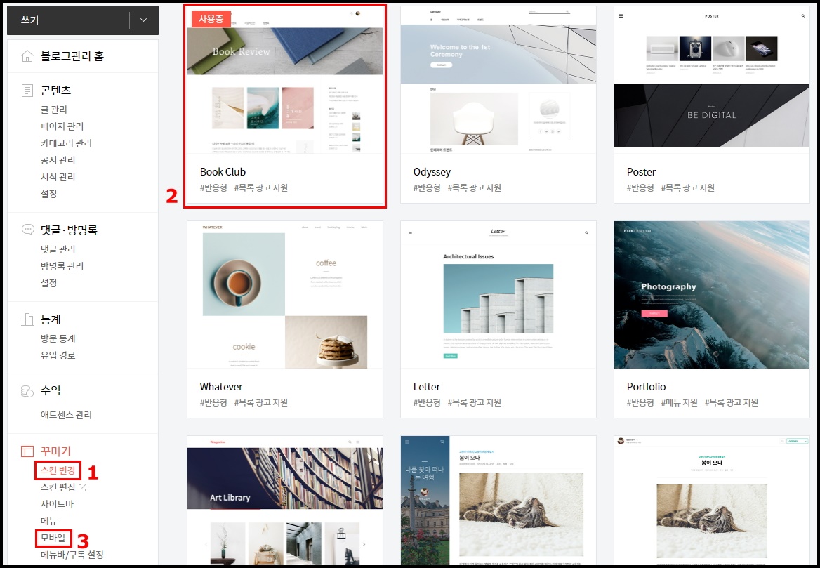 1. "스킨 변경" => 2. "Book Club" 스킨으로 변경 => 3. "모바일" => 4. 티스토리 모바일웹 자동연결 "사용하지 않습니다."로 변경