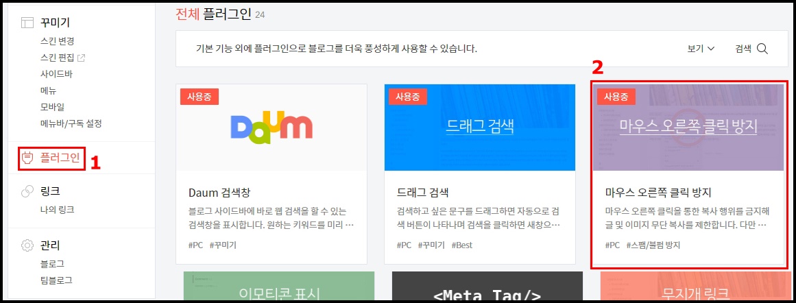 좌측 메뉴바 1. "플러그인" => 2. 마우스 오른쪽 클릭 방지 클릭 후 적용