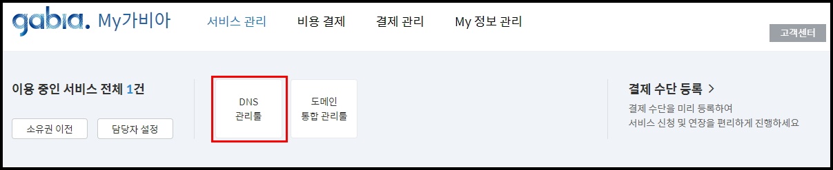 1. 가비아 로그인 => 2. 메인화면 좌측 중앙에 있는 "서비스 관리"