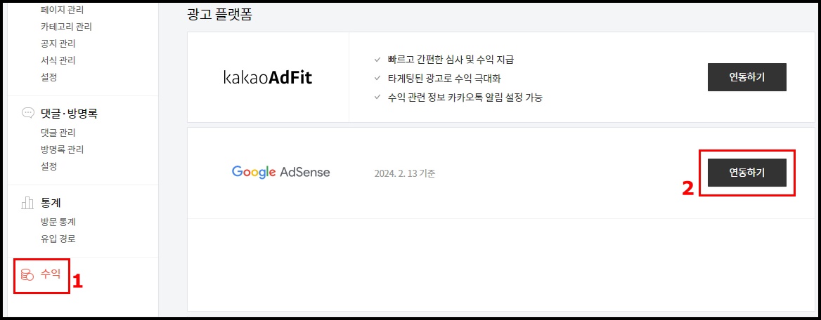 "수익" 클릭 => 광고 플랫폼에 있는 구글 애드센스 "연동하기" 클릭 => "구글 로그인" 클릭 => 본인 애드센스와 연동되어 있는 구글계정으로 로그인 진행 => 티스토리 서비스 로그인 "계속" 클릭