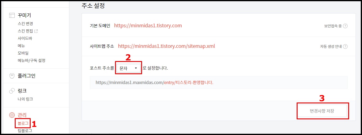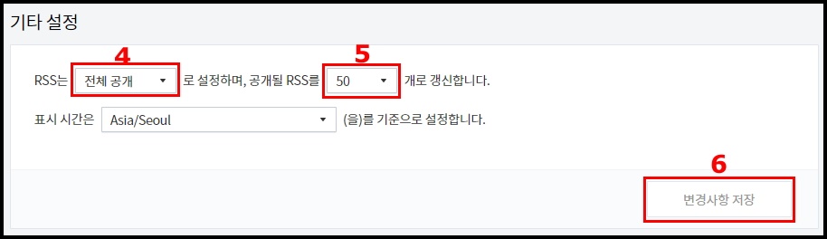 1. "블로그" => 2. 주소설정의 포스트 주소를 "문자"로 설정 => 3. 변경사항 저장 => 4. 기타 설정의 RSS는 "전체공개" => 5. 공개될 RSS "50"개로 갱신 => 6. 변경사항 저장