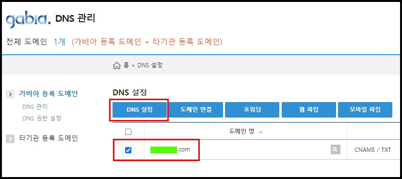 1. 내 도메인 체크 => 2. "DNS 설정" 클릭