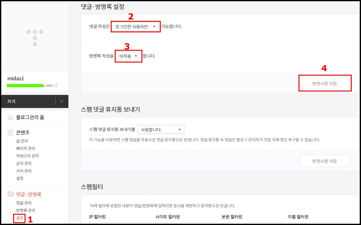 1. "설정" => 2. 댓글은 "로그인한 사용자만" => 3. 방명록 작성은 "비허용" => 4. 변경사항 저장