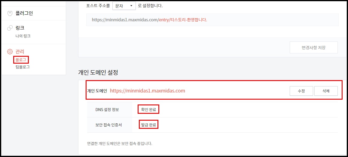 "블로그" => 중간쯤에 있는 개인 도메인 설정에서 "도메인 연결하기" => 도메인 입력창에 "하위 도메인 주소" 입력 후 저장 DNS 설정 정보는 "확인 완료" / 보안 접속 인증서는 약 1시간 뒤 확인했을 때 "발급 완료"로 확인되면 됨