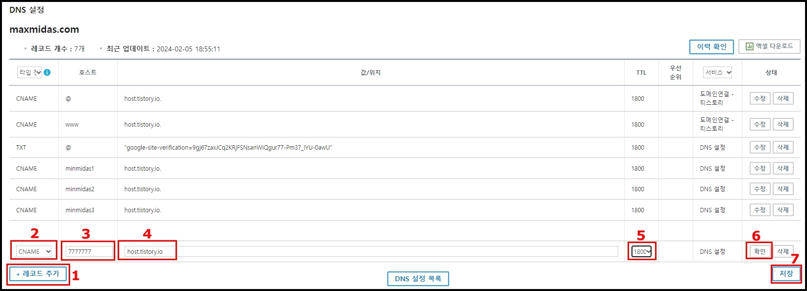 1. "레코드 추가" => 2. 타입 : CNAME => 3. 호스트 : 하위 블로그 주소 (본인의 2차 도메인) => 4. 값/위치 : host.tistory.io. => 5. TTL : 1800 => 6. 상태 : "확인" => 7. "저장"