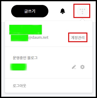 먼저 위 이미지처럼 티스토리 블로그 로그인 => 우측 상단 종 모양 옆에 "영어 대문자 T 모양" 티스토리 아이콘 클릭 => 계정관리 클릭