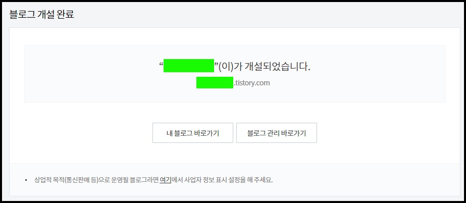 위 이미지 처럼 개설이 되었다는 화면이 보이면 하위 블로그 1개가 추가되었습니다.