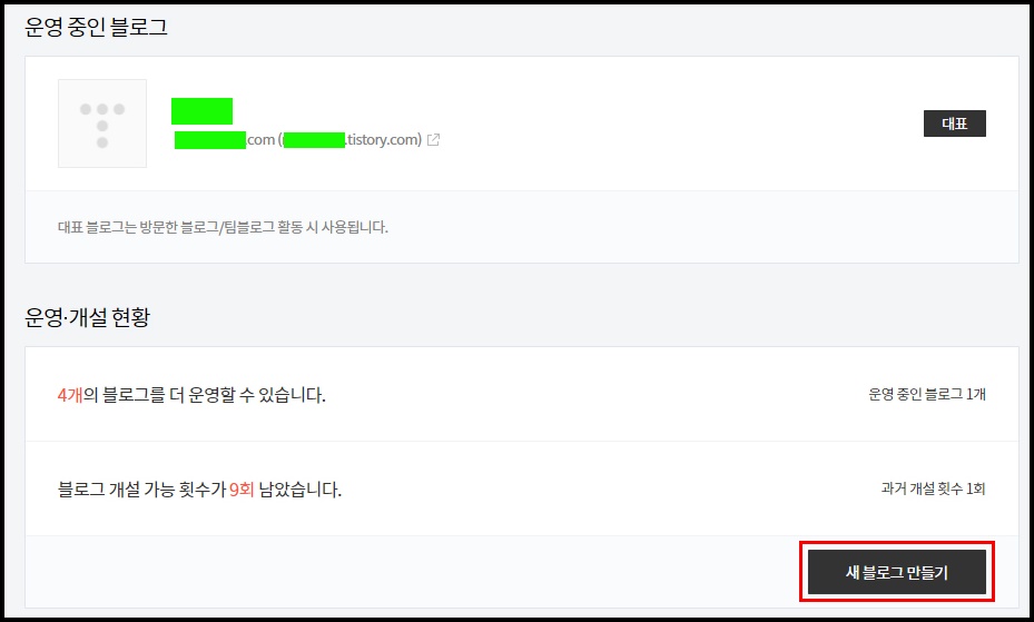 필자는 현재 메인블로그 1개만 운영하고 있어 운영 중인 블로그에 1개의 블로그만 표시되어 있습니다.