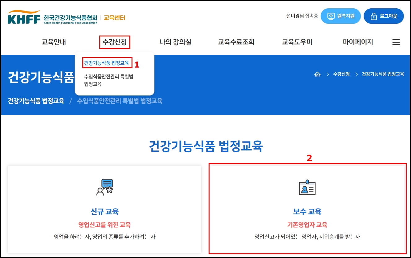 1. 수강신청 메뉴 중 건강기능식품 법정교육 클릭