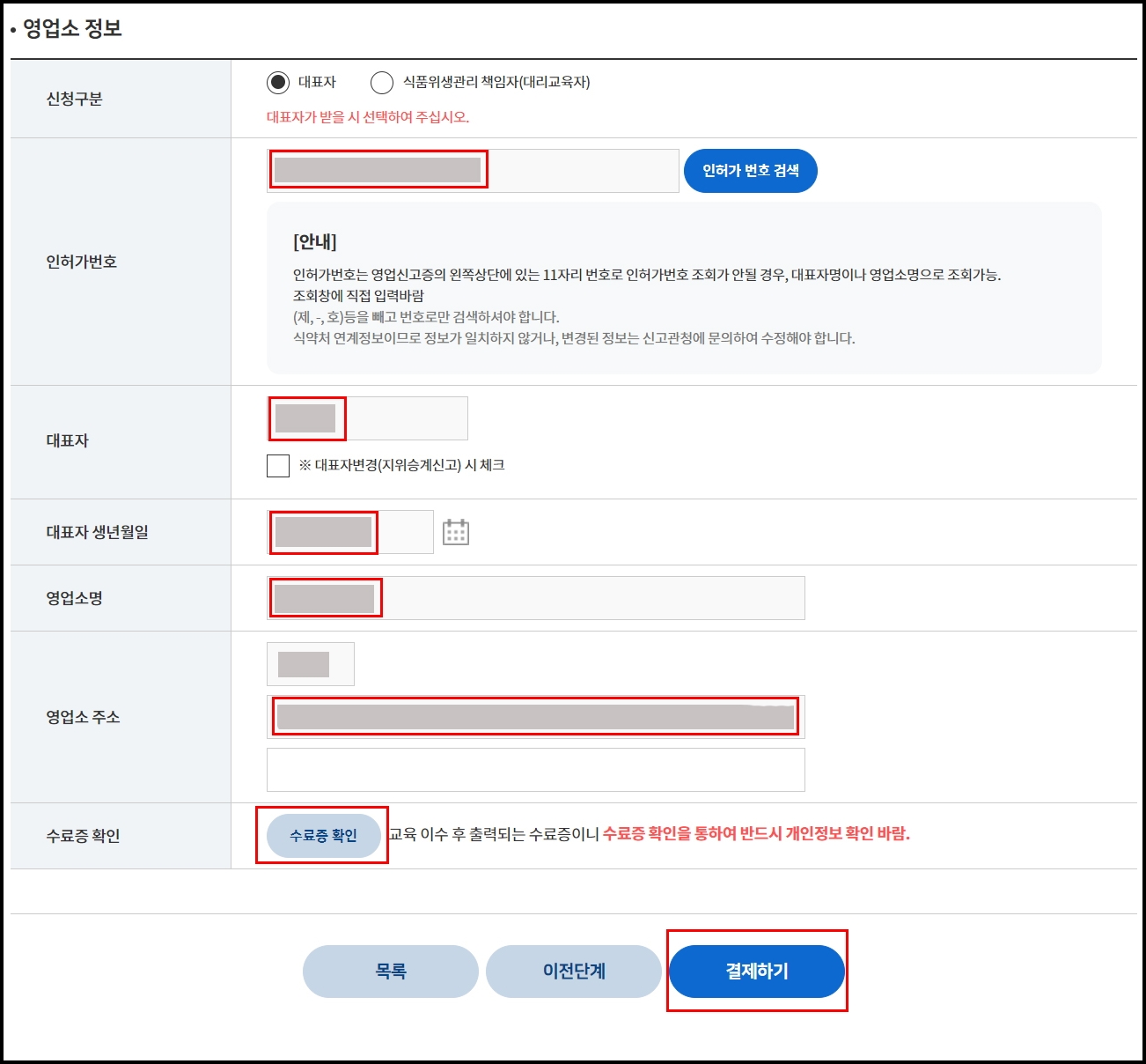 인허가번호, 대표자 이름 및 생년월일, 영업소명, 영업소 주소 등 확인하고 수료증확인을 누르면 수료증 샘플에서 최종 내용 확인하시면 됩니다.