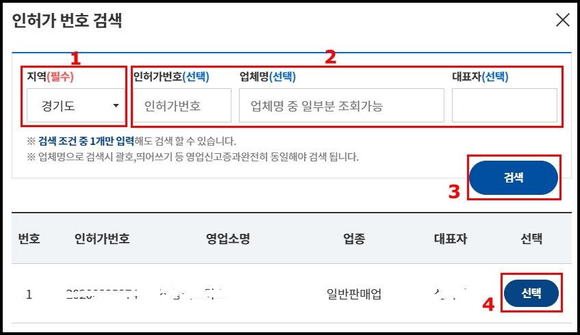 2. 인허가번호, 업체명, 대표자 중 한 가지만 입력해도 조회가 가능합니다.