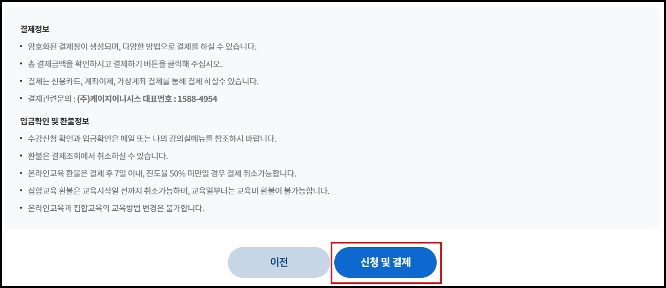 결제정보와 입금확인 및 환불정보 주의사항들을 확인 후 신청 및 결제 클릭