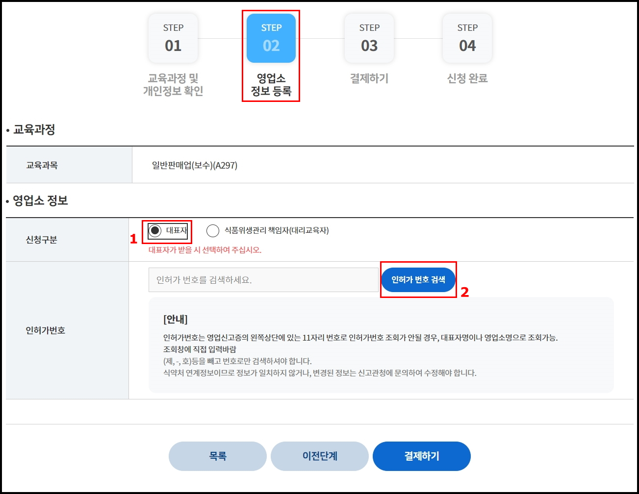 => 인허가번호는 영업신고증의 왼쪽상단에 있는 11자리 번호로 인허가번호 조회가 안될 경우,