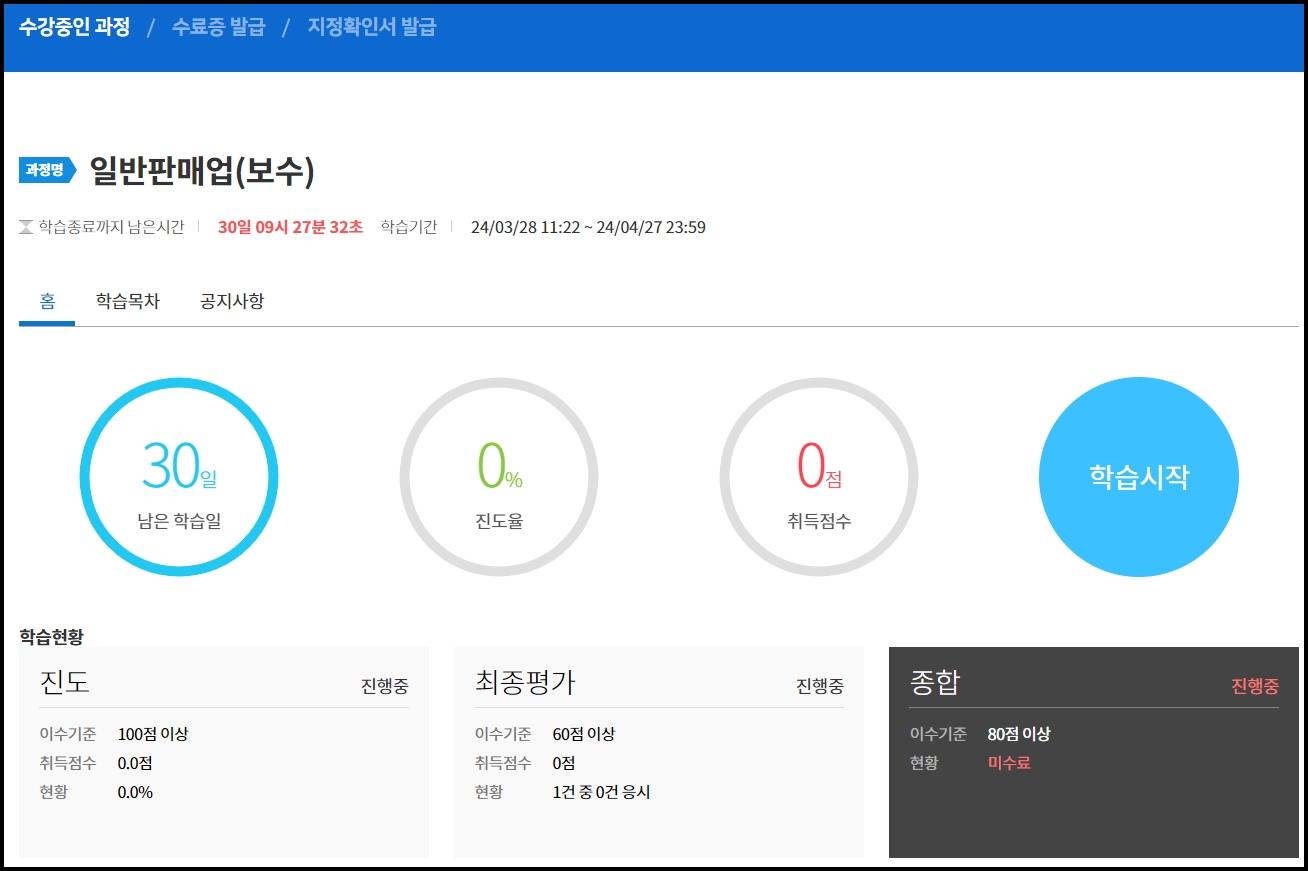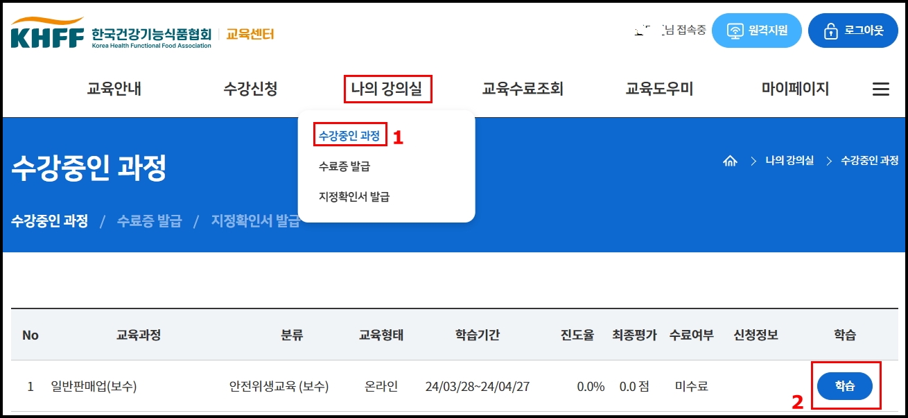 2. 수강 중인 교육과정(일반판매업 보수교육) 확인 후 학습 클릭