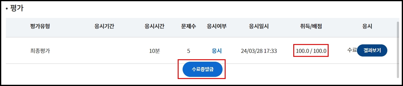 짜~~ 잔 100점 만점에 100점이네요 이제 수료증 발급받으러 가볼까요?