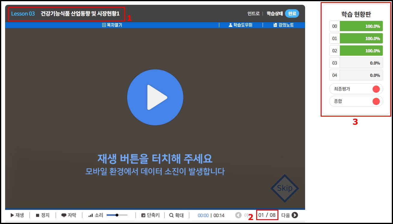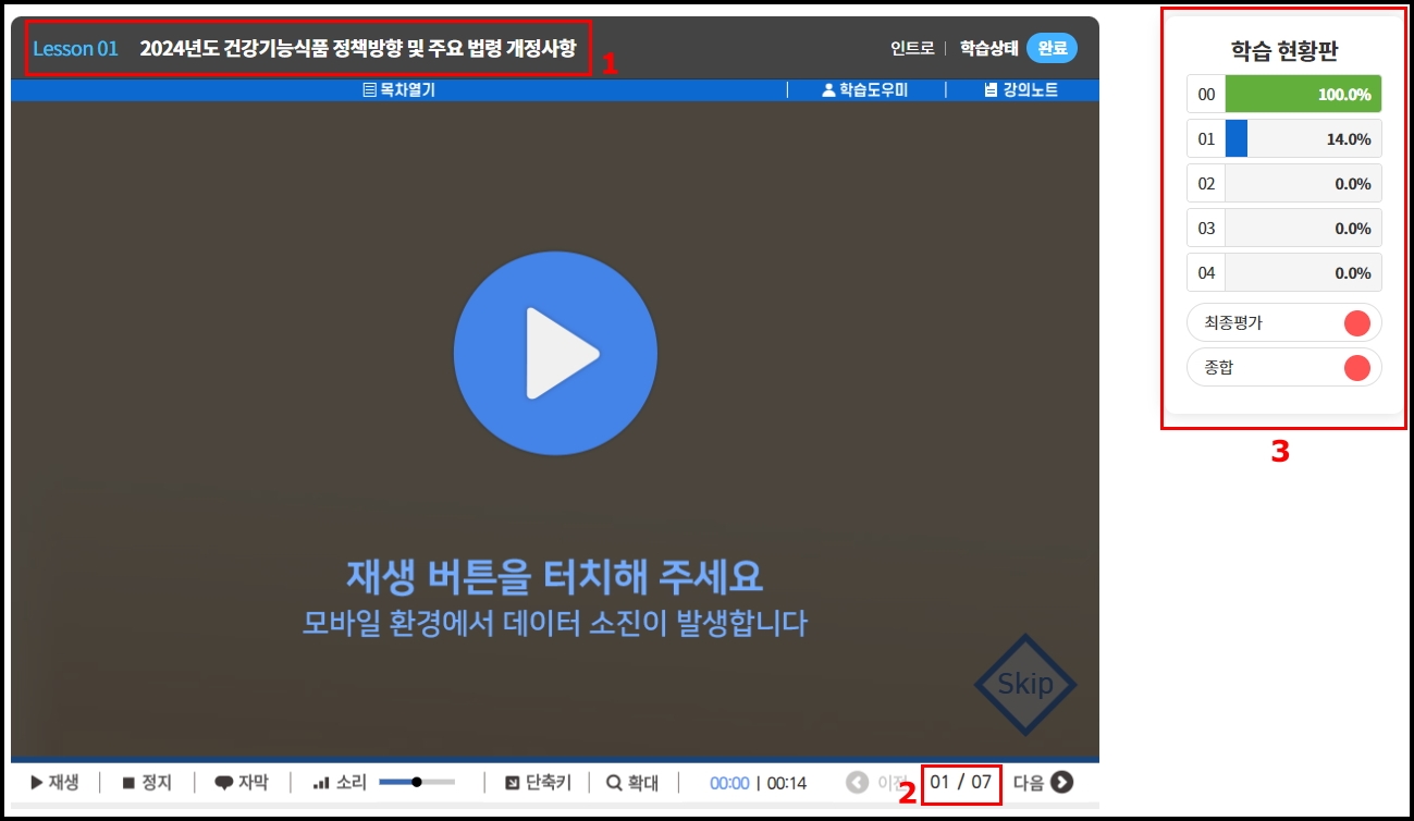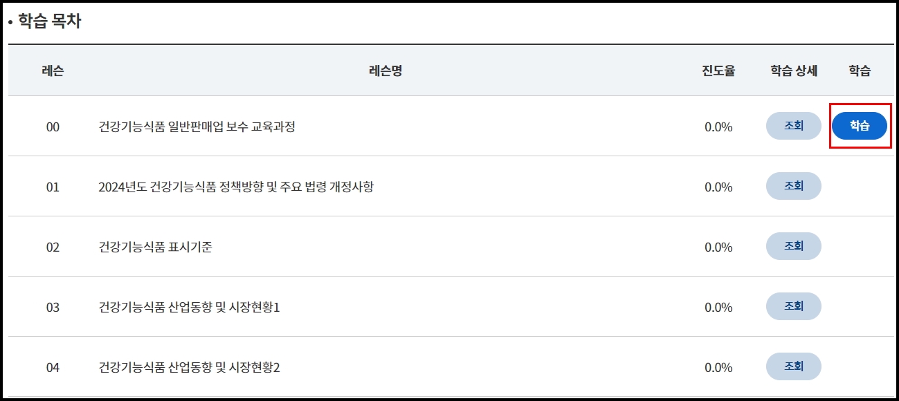 1. 레슨번호 "00" 건강기능식품 일반판매업 보수 교육과정 학습 버튼 클릭 후 온라인 강의를 시작합니다.